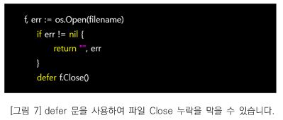 recover문과 비슷하게 Go 언어의 defer문은 함수가 종료되기 직전에 수행되는 문장으로 함수 내에서 사용한 리소스 반환 처리와 같은 상황에 유용합니다. 사용되는 리소스를 생성하고 defer문으로 반환 처리를 예약하면 이후에 생길 에러 상황에서 프로그램이 종료되더라도 리소스 해제 누락을 막을 수 있습니다.