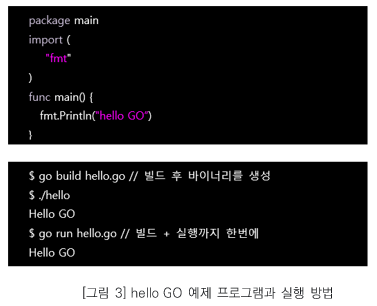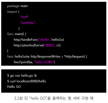 Go 언어는 기본 패키지 이외에도 여러 벤더에서 다양한 패키지를 제공하고 있습니다. 개발자는 이를 활용하여 쉽게 애플리케이션 개발할 수 있습니다. 시스템 프로그램에 자주 사용되는 http 패키지는 물론 통신에 필요한 암호화 모듈까지 기본 내장되어 있어 웹 서버를 쉽게 구축할 수 있습니다. 예를 들어 “hello GO”를 출력하는 웹 서버는 다음과 같이 단 몇 줄로 구현이 가능합니다.