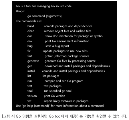 그 외에도 Go 소스 파일의 형식을 맞춰주는 포맷팅(fmt), 사용되는 패키지 리스트업(list), 테스트 코드 수행 등 Go 언어로 패키지를 작성 및 사용하기 위한 여러 가지 기능을 제공합니다.