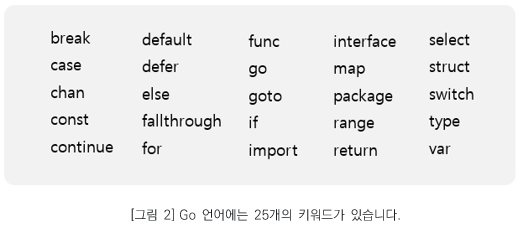 Go 언어는 시스템 프로그래밍에 적합하도록 설계되었으며 C와 구문이 비슷합니다. 이는 대부분의 컴퓨터공학 전공자들이 C 언어를 배울뿐더러 기존 시스템 프로그래밍 영역에서 C와 C++이 많이 사용되었기 때문에 개발자들이 새로운 언어에서 빠르게 생산성을 발휘할 수 있도록 하기 위함입니다. Go 언어는 C 와 비슷하지만 키워드가 25개로 C(37개), C++ 11(84개)에 비해 간결합니다. C와 C++의 복잡한 요소를 최대한 줄이고 간결하게 만들어져 C 언어에 경험이 있는 개발자라면 쉽게 배울 수 있습니다.