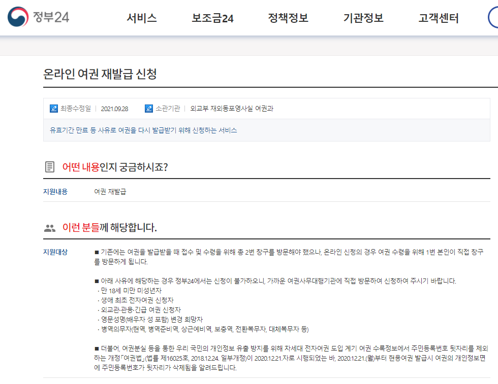 온라인 여권 재발급 신청 | 정부서비스 | 정부24