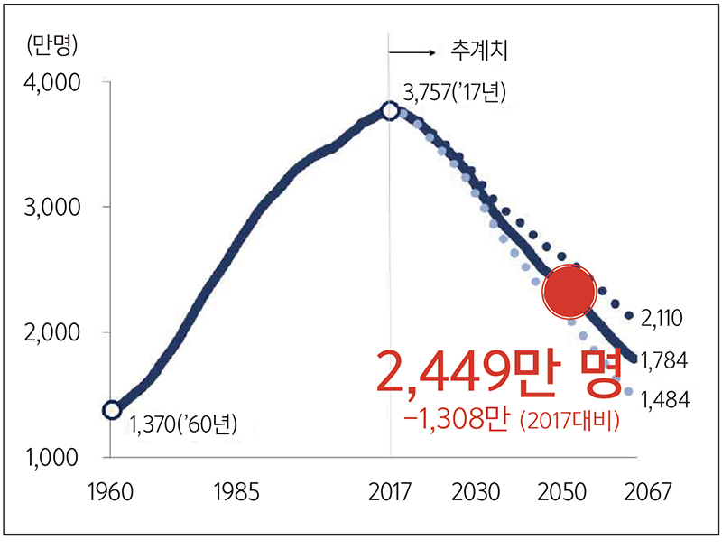 하지만 상황은 그리 간단하지 않다. 특히 기업의 경우 앞으로 인구 감소로 인한 구인난, 인건비 상승, 내수시장의 축소 등의 문제로 어려움을 겪을 가능성을 우려하고 있다. 통계청의 예측에 따르면 15세에서 64세 인구를 말하는 생산가능연령이 2017년 3,757만 명이었던 데에 반해 2050년에는 2,449만 명으로 약 1,308만 명 감소할 것으로 보고 있다. 서울인구 전체를 넘어서는 수의 사람들이 사라지는 것이다. 그리고 이는 경제 전반의 구조조정을 요구하게 된다.