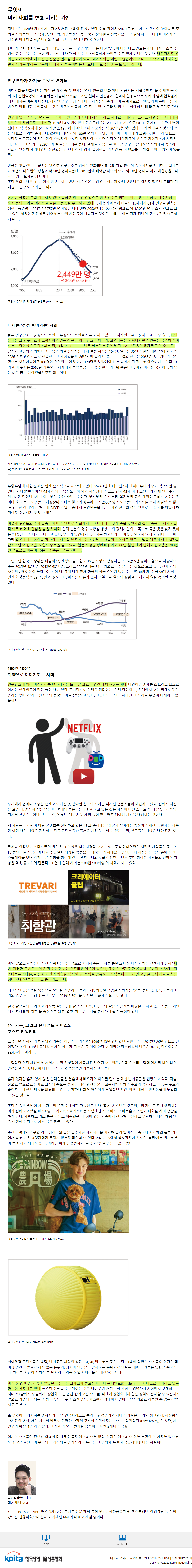 지난 2월, 2020년 제1회 기술경영부서장 교육이 진행되었다. 이날 강연은 '2020 글로벌 기술트렌드와 핫이슈'를 주제로 사회트렌드, 지식재산, 인문학, 기업브랜드 등 다양한 분야별로 진행되었다. 이 글에서는 국내 1호 미래캐스터 황준원 미래채널 MyF 대표의 사회트렌드 강연에 대해 소개한다.
