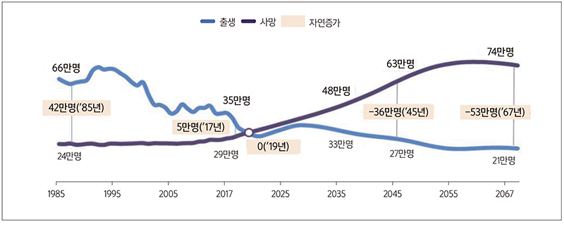 그림 3. 연도별 출생자수 및 사망자수 (1985∼2067년)