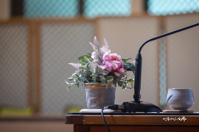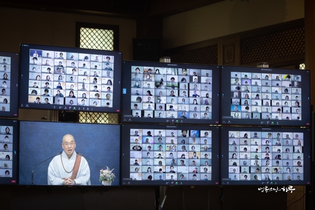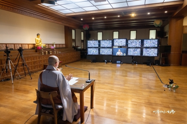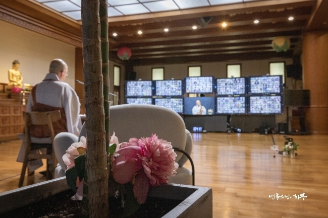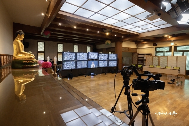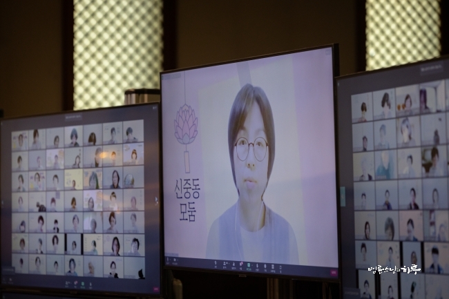 아침 해가 뜨고 나서 오전 10시 정각에 1층 법당에 마련된 방송실에 자리했습니다. 오늘은 오전과 저녁에 두 번에 걸쳐서 전법활동가 법회를 하는 날입니다. 먼저 주간반 전법활동가들이 모두 화상회의 방에 입장한 가운데 법회를 했습니다.