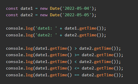 Date.getTime()는 UTC 시간을 millisecond로 리턴합니다. UTC는 1970/01/01를 0초로 지금까지 흐른 시간을 표현한 것입니다. millisecond이기 때문에 비교 연산자를 이용하여 크기를 비교할 수 있고, 또한 동등 연산자로 비교할 수도 있습니다.