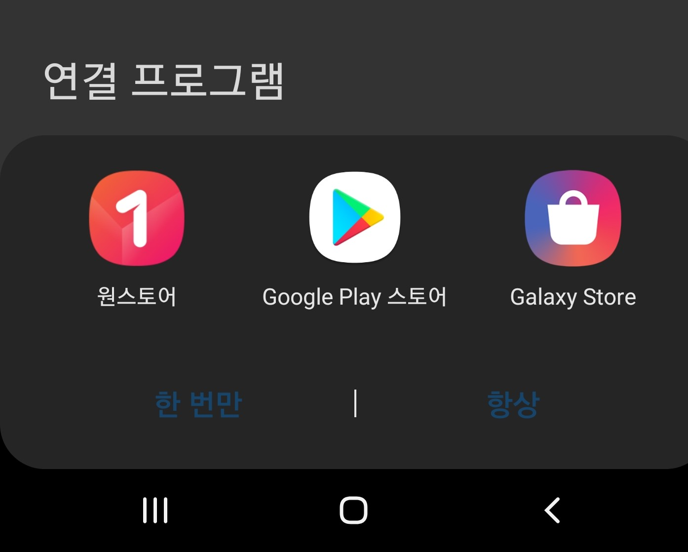 구글플레이 앱은 자신들의 앱을 오픈하기 위한 스킴 값으로 market:// 란 값을 사용하고 있습니다. OneStore, 삼성 앱스토어 등의 오픈 마켓 또한 이 스킴 값을 사용합니다. 따라서 안드로이드 이용자들은 아래처럼 어떤 앱을 실행시켜야 하는지에 선택하는 화면을 보게 됩니다.