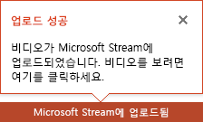 - 업로드 프로세스는 비디오 길이에 따라 몇 분 정도 걸릴 수 있습니다. PowerPoint 창의 맨 아래에 있는 상태 표시줄에서 진행률이 추적되고, 업로드가 완료되면 PowerPoint에 메시지가 표시됩니다.