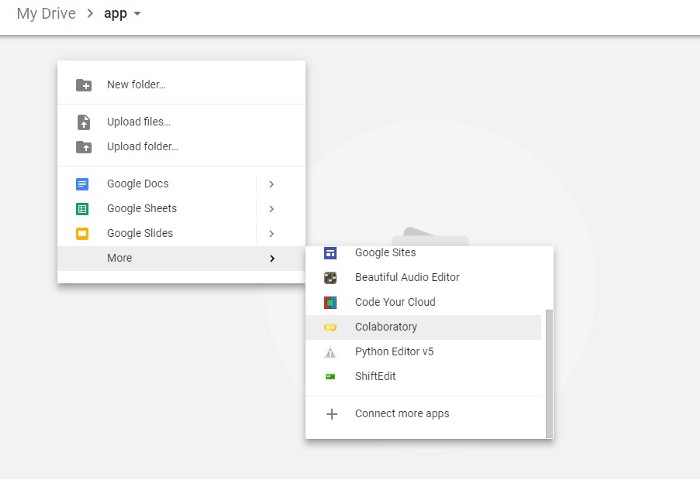 Since Colab is working on your own Google Drive, we first need to specify the folder we’ll work. I created a folder named “app” on my Google Drive. Of course, you can use a different name or choose the default Colab Notebooks folder instead of app folder.