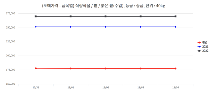 붕어빵 앙금을 만들 때 쓰는 수입산 붉은팥(40kg)의 상승세 역시 만만치 않다. 한국농수산식품유통공사(aT) 농산물유통정보(KAMIS)에 따르면 수입산 붉은팥(40kg)의 도매가격은 지난 4일 기준으로 평균 27만원으로 집계됐다. 지난해 평균 25만1500원이었는데 불과 1년도 되지 않는 사이 7.35% 올랐다.