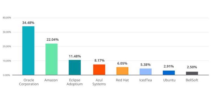 아래 차트는 Oracle이 여전히 시장에서 가장 큰 점유율을 차지하고 있음을 보여주지만 그 점유율은 절반 이상 감소했습니다. 2020년 Oracle은 "Java 시장의 약 75%"를 차지했지만 현재는 35% 미만입니다.