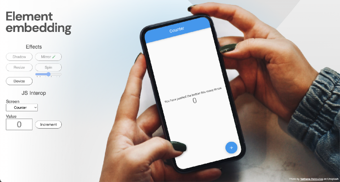 Flutter 웹 데모의 스크린샷. 전통적인 Flutter 카운터 앱이 표시되지만 CSS에서 기울어지고 변형되어 여성이 iPhone을 들고 있는 사진의 일부처럼 보입니다.