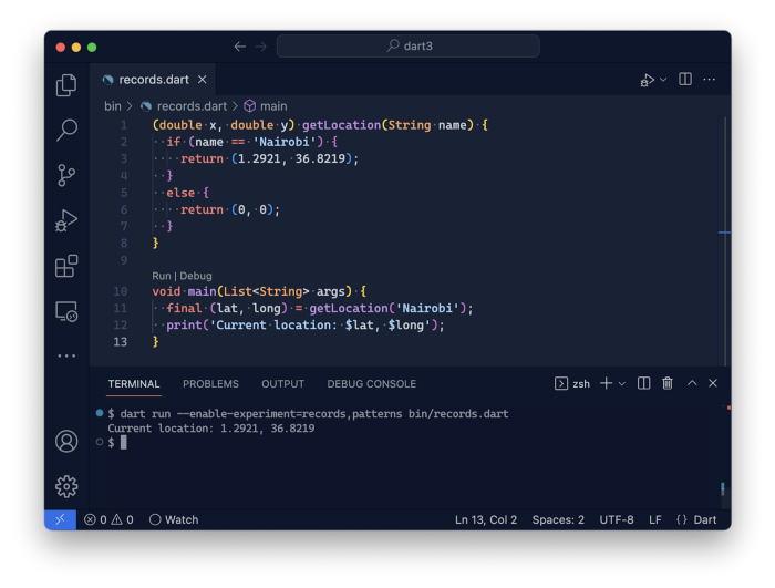 새로운 레코드 및 패턴 기능의 데모를 실행하는 VSCode의 이미지. Dart가 이제 여러 값을 반환할 수 있음을 보여줍니다. 데모 코드는 https://gist.github.com/timsneath/a75fd9f76b5b61c42676c9232160d14d에 있습니다.