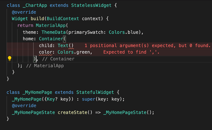 The Error Lens extension highlights the error lines in the code and appends the error details at the end of the line. Error icons are also displayed in the gutter.