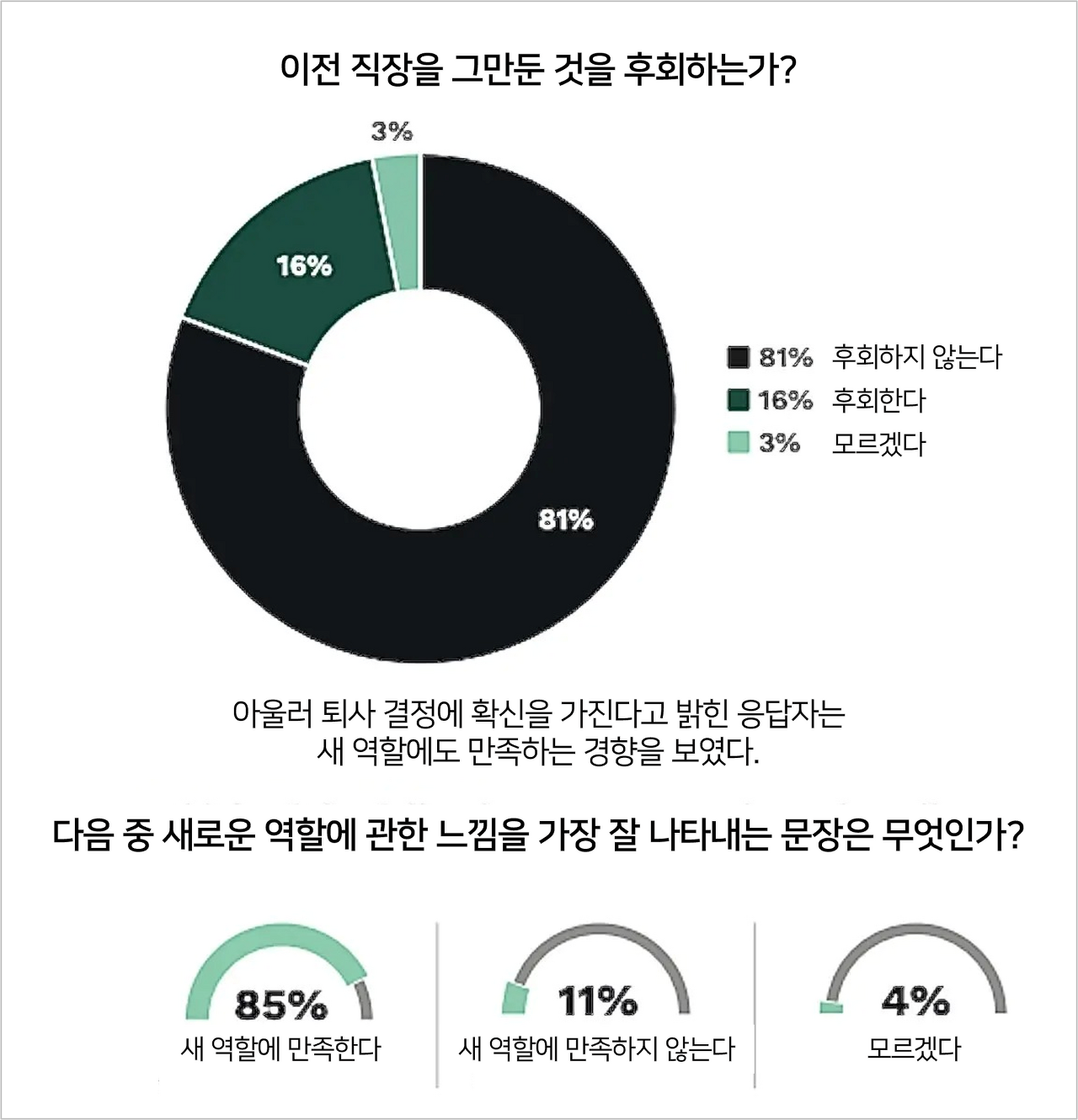 그 결과, 퇴사자들은 이전 직장을 떠난 것을 후회하지 않을 뿐만 아니라 85%는 새 역할에 만족하고 있다고 답했다. 소수(6%)만이 이전 직장 복귀를 고려하고 있다고 전했다.