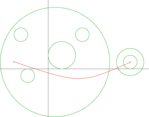 빨간 실선은 어린 왕자가 출발점에서 도착점까지 도달하는데 있어서 필요한 행성계 진입/이탈 횟수를 최소화하는 경로이며, 원은 행성계의 경계를 의미한다. 이러한 경로는 여러 개 존재할 수 있지만 적어도 3번의 행성계 진입/이탈이 필요하다는 것을 알 수 있다.