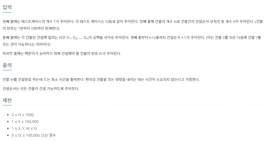 건물 W를 건설완료 하는데 드는 최소 시간을 출력한다. 편의상 건물을 짓는 명령을 내리는 데는 시간이 소요되지 않는다고 가정한다.