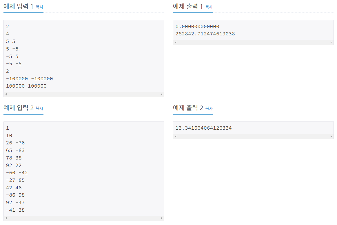 각 테스트 케이스마다 정답을 출력한다. 절대/상대 오차는 10-6까지 허용한다.
