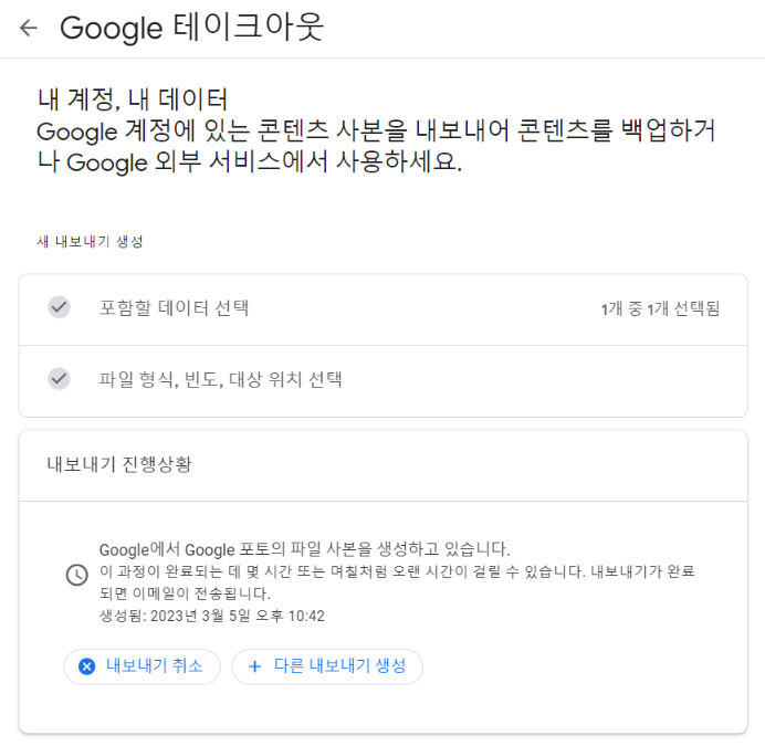 설정을 마무리하면 ‘내보내기 생성’을 클릭한다. 이제 기다리기만 하면 된다. 구글은 내보내기가 언제 끝날지 예측해주며, 구글 포토에 저장된 사진의 용량에 따라 몇 시간에서 며칠까지 걸린다.