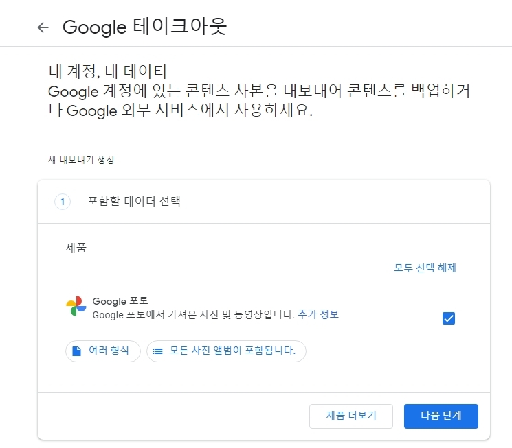 그러면 구글 서버에 저장된 데이터를 다운로드하는 서비스인 ‘Google 테이크아웃’ 페이지로 이동한다. 구글 포토를 통해 해당 페이지로 이동하면 구글 포토가 자동으로 선택되어 나온다. 구글 계정과 연관된 다른 데이터는 포함되지 않는다. 이제 ‘다음 단계’를 클릭한다.