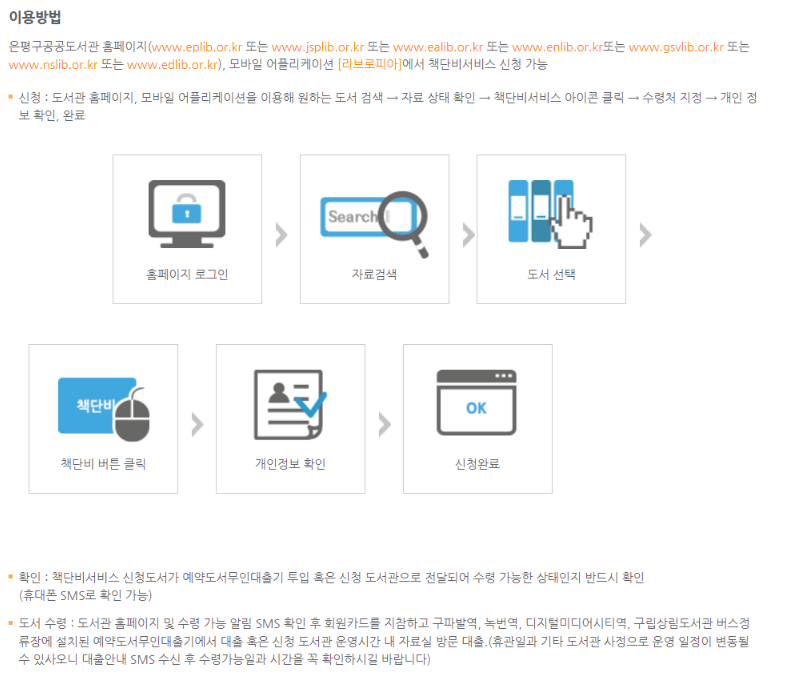 - 신청 : 도서관 홈페이지, 모바일 어플리케이션을 이용해 원하는 도서 검색 → 자료 상태 확인 → 책단비서비스 아이콘 클릭 → 수령처 지정 → 개인 정보 확인, 완료