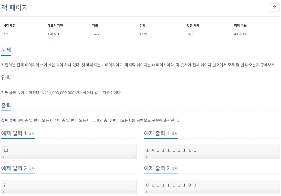 지민이는 전체 페이지의 수가 N인 책이 하나 있다. 첫 페이지는 1 페이지이고, 마지막 페이지는 N 페이지이다. 각 숫자가 전체 페이지 번호에서 모두 몇 번 나오는지 구해보자.