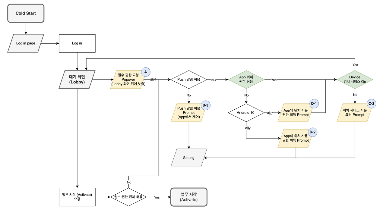 Flutter로 갈아엎으면서 KMM과 비교해 구현 난이도가 높았던 부분도 있었습니다. 권한 획득이나 푸시 수신 시나리오 같은 경우 각 플랫폼에서 제안하는 개발 가이드라인에 차이가 있는데요. KMM 때는 네이티브 영역을 각각 구현해 코드 복잡도가 높지 않았는데 Flutter로 변환하면서 하나의 코드로 작성하다 보니 플랫폼에 따른 분기 코드가 종종 발생해서 코드 가독성을 저해하는 부분이 있었습니다. 아래는 Flutter로 변환한 후 Android와 iOS 앱 실행 후 흐름입니다.