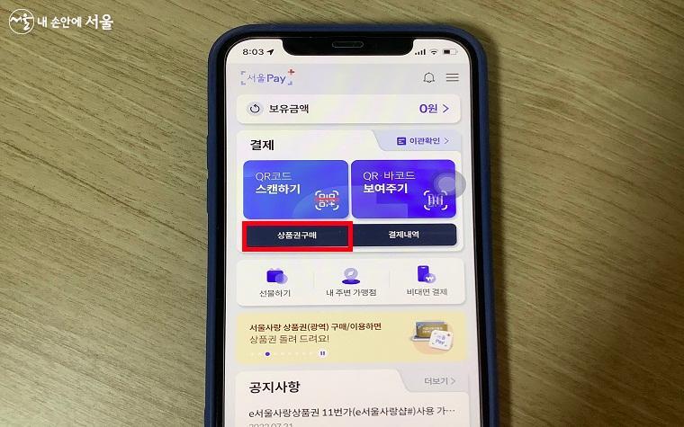 서울페이플러스 메인 화면에서 '상품권 구매'란을 찾을 수 있다. ⓒ송수아