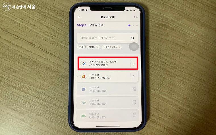 상품권 선택에서 e서울사랑상품권을 선택한다 ⓒ송수아