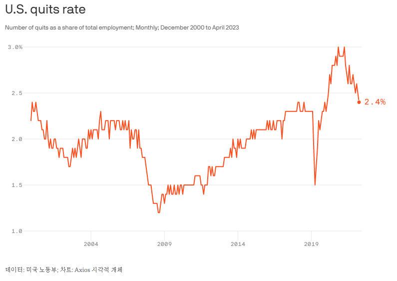 숫자로 알아보기 : 오늘 아침 발표된 Job Openings and Labor Turnover Survey에 따르면 4월 퇴사율은 2.4%로 떨어졌습니다 .