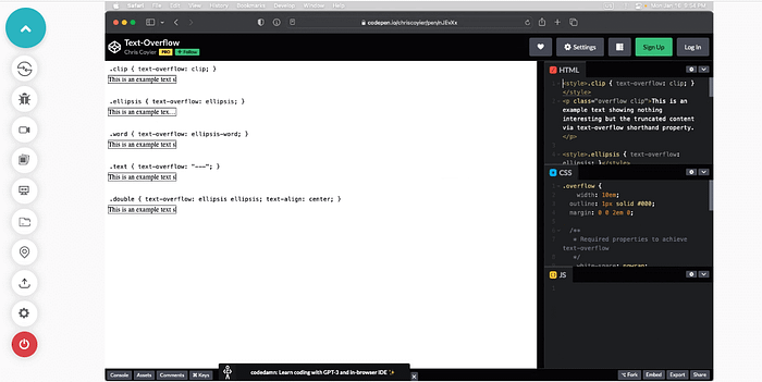 In CSS, the text-overflow property is used to indicate that specific text has overflowed and is now hidden. When you add this property, overflowed content will be trimmed, and a custom string or ellipsis will get visible on display.