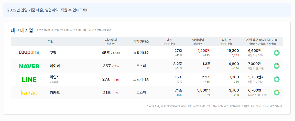 네이버, 카카오, 쿠팡 등 국내를 대표하는 IT 기업부터 당근마켓, 토스, 두나무 등 요즘 뜨는 스타트업의 정보도 모두 실시간으로 - 테크컴퍼니즈 코리아
