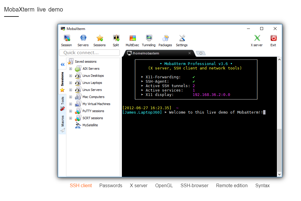 MobaXterm은 모든 중요한 원격 네트워크 도구 (SSH, X11, RDP, VNC, FTP, MOSH, ...)와 Unix 명령 (bash, ls, cat, sed, grep, awk, rsync, ...)을 Windows 데스크탑에 제공합니다. , 즉시 작동하는 단일 휴대용 exe 파일 로 제공됩니다. 지원되는 네트워크 프로토콜에 대한 추가 정보