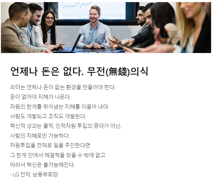 무전은 ‘리더는 언제나 돈이 없는 환경을 만들어야 한다’는 뜻이다. 돈이 없어야 지혜가 나오고, 자원 한계를 뛰어 넘는 지혜를 이끌어 내야 사람과 조직이 개발된다는 독창적 논리다.