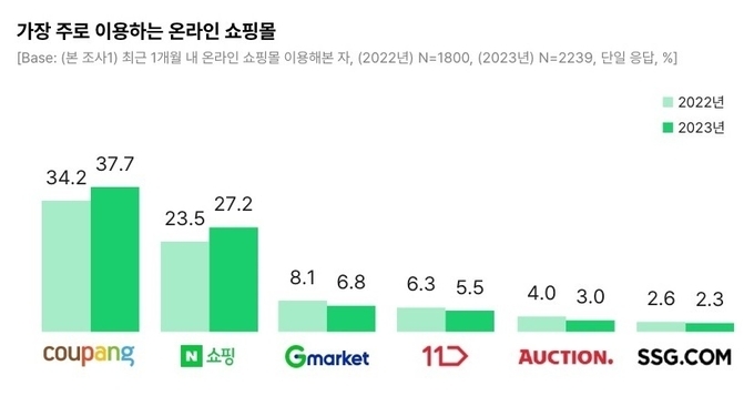 온라인 채널은 주 쇼핑 방식으로 자리 잡았으며 상위 온라인 쇼핑몰의 강세 또한 지속되고 있다. 오픈서베이 ‘온라인 쇼핑 트렌드 리포트 2023’에 따르면, 평소 개인과 가정에서 사용할 목적으로 물품 구매 시 온라인 채널을 통해 구매하는 비중이 가장 높았다.