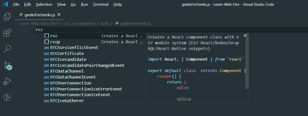 If you are a true React JS developer then this is a must have snippet for you, because it simply does just right for you. This plugin provides you JavaScript and React/Redux snippets in ES7 with Babel plugin features for VS Code.