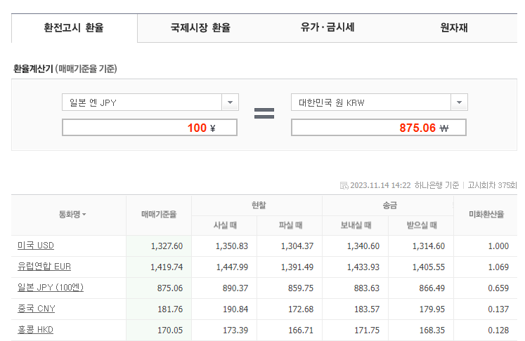 환전 고시 환율 2023.11.14 14:29 하나은행 기준 고시회차 379회