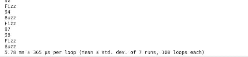 Timed results for FizzBuzz using itertools. | Image: Emmett Boudreau
