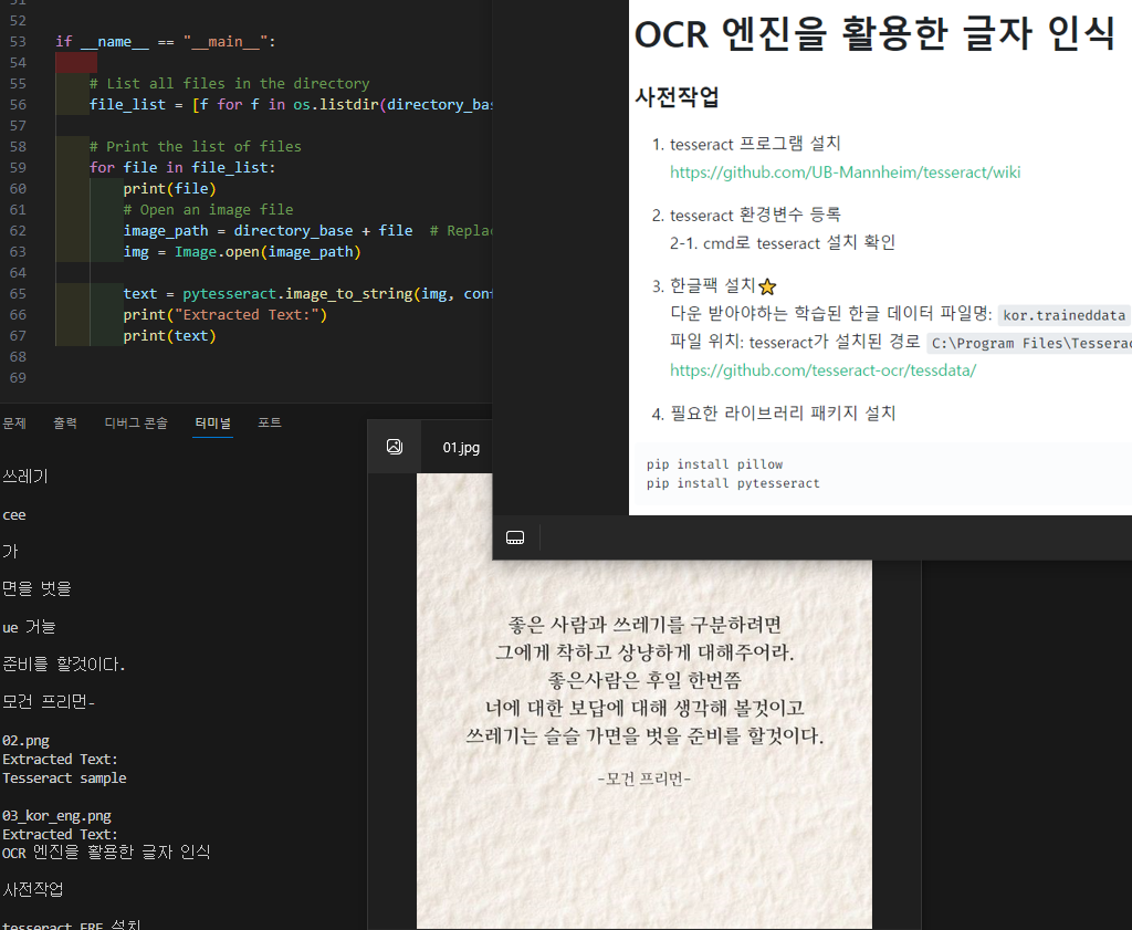 | [python] 이미지에서 텍스트 추출하기, tesseract, OCR, 지정 폴더안의 이미지 전부 텍스트 추출하기 (0) | 2024.02.05 |