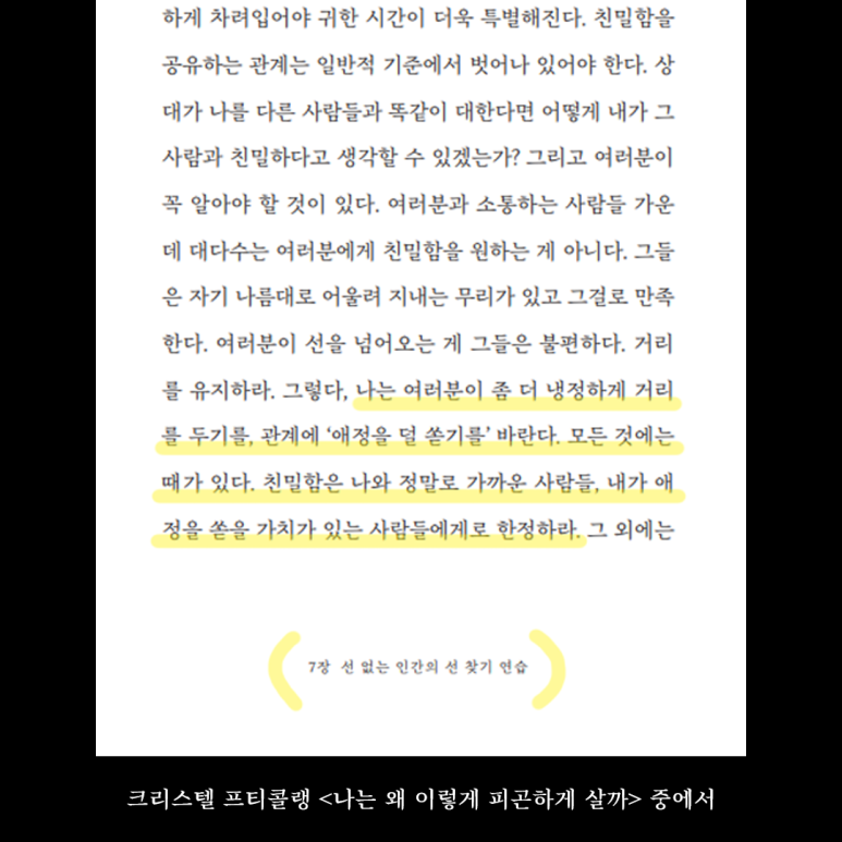 "인간관계에 있어서도 자정능력이 떨어질 때가 있다. 그럴 땐 나도 모르게 상대방에게 송곳 같은 말과 행동을 하게 되고 온전히 내 실수로 관계가 훼손된다. 모든 관계를 깊게 가지고 갈 수 없다. 나는 좋은 관계와 안 좋은 관계가 있을 뿐이지 괜찮은 관계란 없다고 생각한다. 적당한 관계를 유지하는 순간 내 자정능력이 떨어지고 굳이 그렇게 정리하지 않을 관계도 스스로 못 참고 안 좋게 정리해버리는 경우가 생긴다."