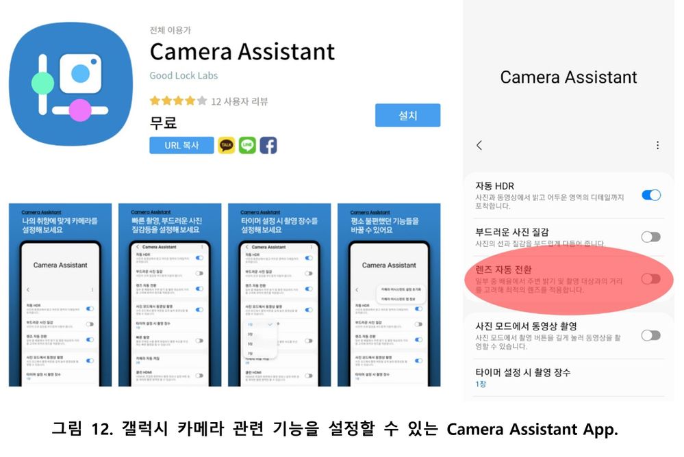 하지만 피사체와의 거리가 40cm 이내로 가깝거나 조도 조건이 맞지 않으면 3배나 10배 줌 카메라가 자동적으로 광각 카메라로 전환되었기 때문에 갤럭시 스마트폰 카메라 어플의 기본 “사진”모드 에서는 이러한 광각 줌 렌즈를 제대로 활용할 수 없었습니다. 다행이도 이러한 문제는 최근에 갤럭시 스토어에서 출시된 “카메라 어시스턴트” 앱을 활용하면 손 쉽게 해결이 가능합니다. 갤럭시 스마트폰 카메라 렌즈의 자동전환 기능을 사용하고 싶지 않으신 분들은 앱의 여러가지 설정 항목 중에서 “렌즈 자동 전환”을 [그림 12]와 같이 사용하지 않음으로 “OFF” 시켜 주시기 바랍니다.