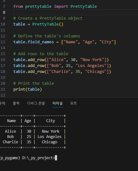 [python] pip install prettytable, 표 형태로 데이터를 보여준다.