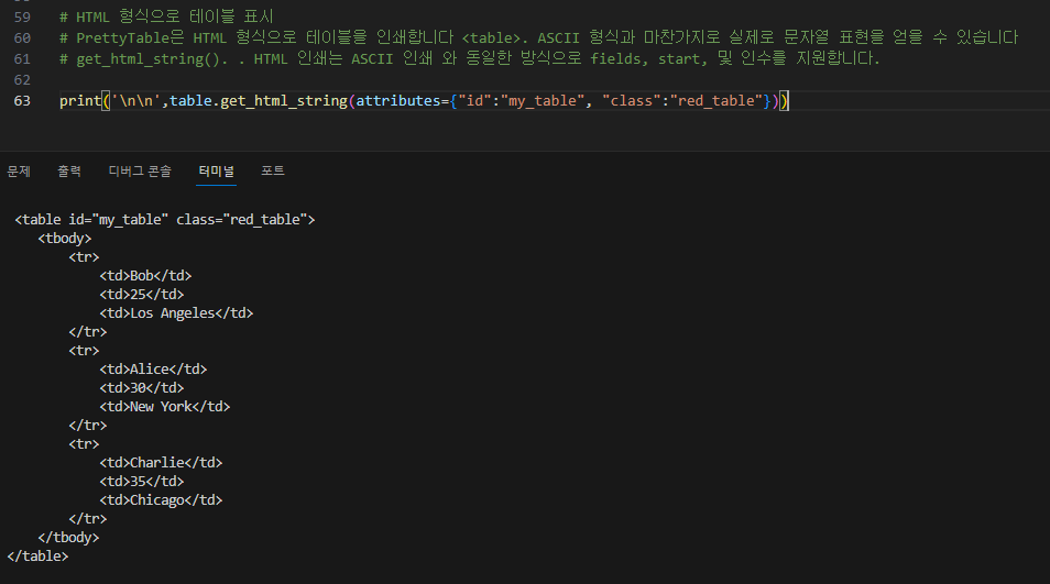 # PrettyTable은 HTML 형식으로 테이블을 인쇄합니다 <table>. ASCII 형식과 마찬가지로 실제로 문자열 표현을 얻을 수 있습니다