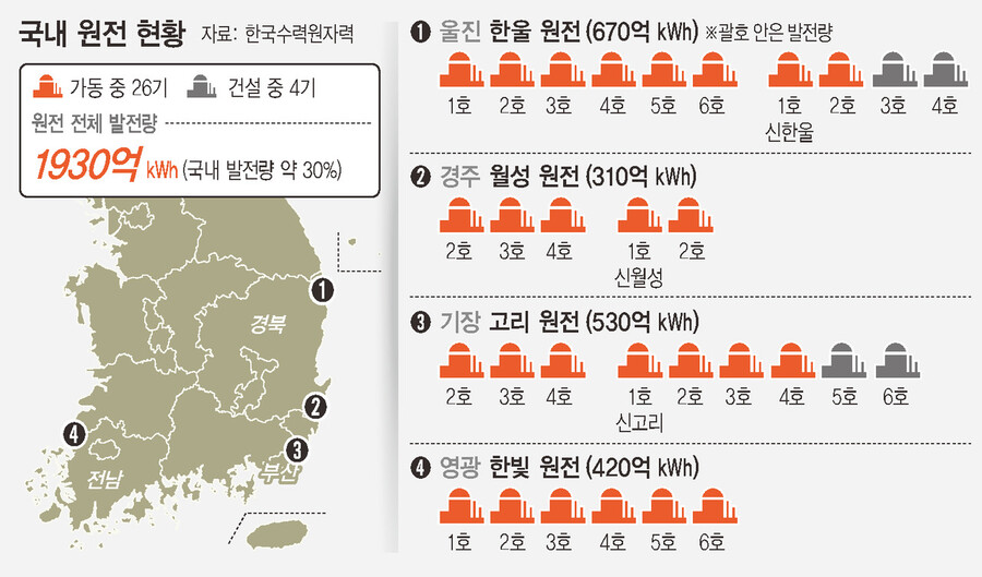 경상북도 북동쪽 끝 면적 989㎢, 인구 4만6390명의 도시 울진군은 세계 최대의 원전 밀집 지역이다. 신한울 3, 4호기는 이곳에 들어서게 될 9, 10번째 원전이다. 2016년 발생한 경주 지진을 계기로 문재인 정부는 신한울 3, 4호기 건설 계획을 중단했지만, ‘탈원전 정책 폐기’ 공약을 내세운 윤석열 정부는 이 원전 건설을 재개하기로 결정했다. 세계적 대형 원전 단지로 꼽히는 캐나다 피커링과 인도 라자스탄, 우크라이나 자포리자(원전 6기)보다도 높았던 밀집도를 더 높인 셈이다. 그만큼 원전 1기의 문제가 연쇄 사고로 이어질 수 있는 위험도 크다는 얘기다.