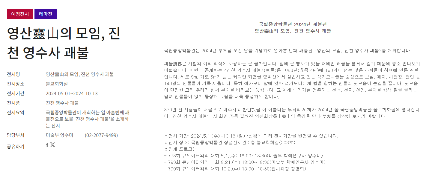 국립중앙박물관,국립중앙박물관 2024년 괘불전 영산靈山의 모임, 진천 영수사 괘불 국립중앙박물관은 2024년 부처님 오신 날을 기념하여 열아홉 번째 괘불전 <영산의 모임, 진천 영수사 괘