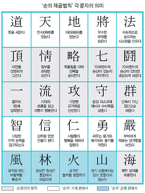 손정의 회장은 손자병법과 자신의 경영철학을 모아 25자로 인생전략을 정리한 바 있습니다. 뜻을 품고 비전을 세우고 전략을 갖는다는 메시지입니다. 이 가운데 전략에 해당하는 일류공수군(一流攻守群)이라는, 5자를 풀이하면 이렇습니다.