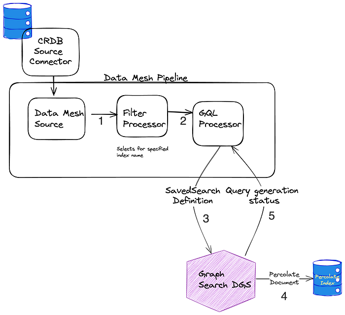As previously mentioned, what is stored in the database is our custom Graph Search filter DSL, which is not the same as the Elasticsearch DSL, so we cannot directly index the event to the percolate index. Instead, we issue a mutation to the Graph Search DGS. The Graph Search DGS translates the DSL to an Elasticsearch query.