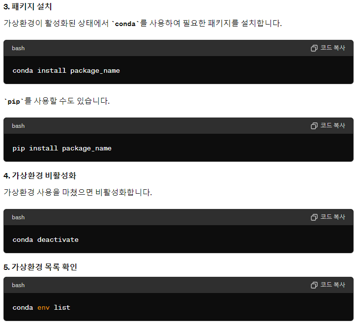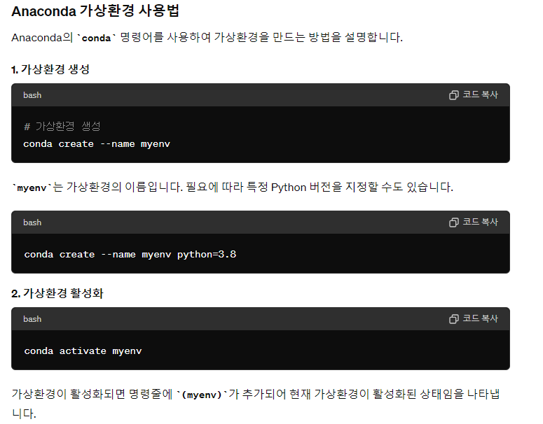 이와 같이 Python의 `venv` 모듈과 Anaconda의 `conda` 명령어를 사용하여 가상환경을 만들고 관리할 수 있습니다. 가상환경을 통해 프로젝트 간의 종속성 문제를 효과적으로 관리할 수 있습니다.