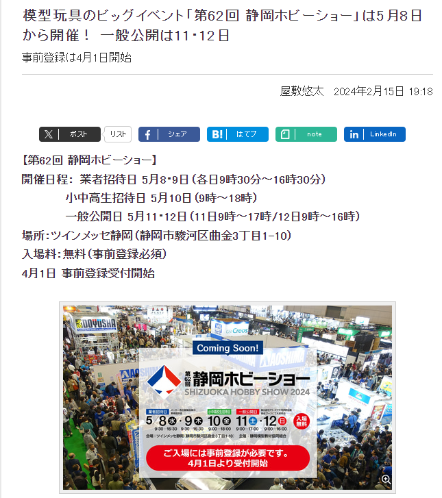模型玩具のビッグイベント「第62回 静岡ホビーショー」は5月8日から開催! 一般公開は11・12日