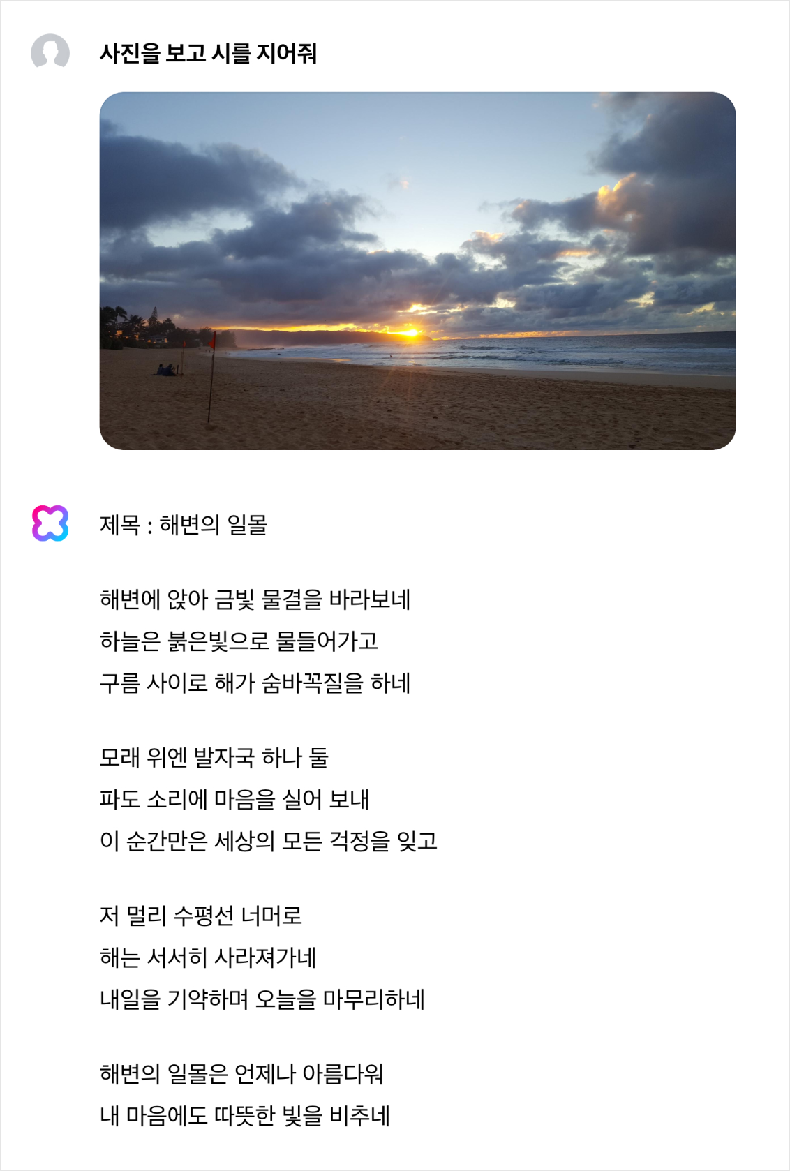 HCX LLM 본연의 기능에 가깝지만, 이미지에 포함된 요소들을 기반으로 창의적인 글쓰기가 가능합니다.